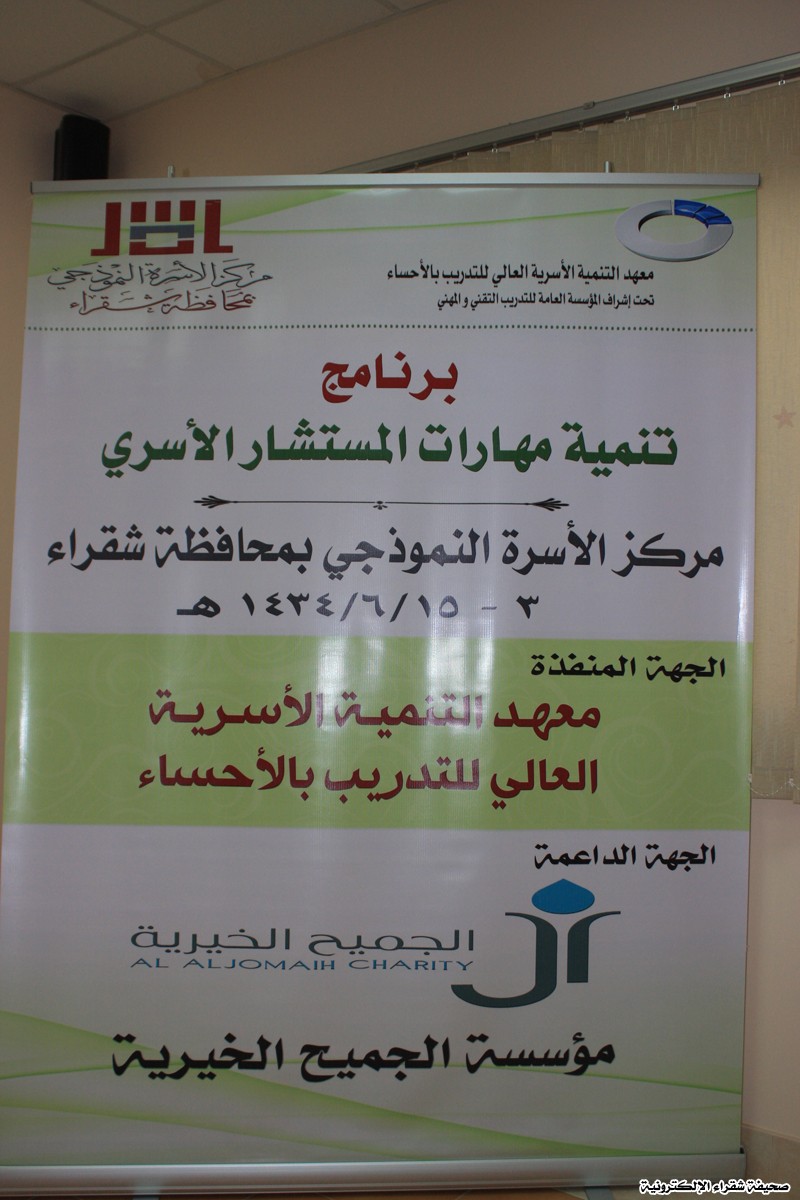 افتتح سعادة محافظ شقراء محمد بن سعود الهلال برنامج تنمية مهارات المستشار الأسري بحضور فضيلة رئيس مجلس إدارة الجمعية الخيرية ورئيس مركز الأسرة فضيلة الشيخ عبد الله بن إبراهيم العثمان والتي ينظمها مركز الأسرة النموذجي بشقراء وبرعاية مؤسسة آل الجميح الخيرية وينفذه معهد التنمية الأسرية العالي للتدريب بالأحساء ويهدف البرنامج لإعداد وتأهيل مستشارين ومستشارات أسريين و يستهدف تدريب ثلاثين مستشارا وعشرين مستشارة لمدة خمسين ساعة تدريبية على مدى عشرة أيام بمعدل خمس ساعات يوميا مساء ويعتبر اول برنامج من نوعه في محافظة شقراء, ويتولى التدريب ثمانية مدربين معتمدين ومؤهلين لمثل هذه البرامج. ويمنح المتدربين في نهاية البرنامج شهادة معتمدة من المؤسسة العامة للتدريب التقني والمهني.
