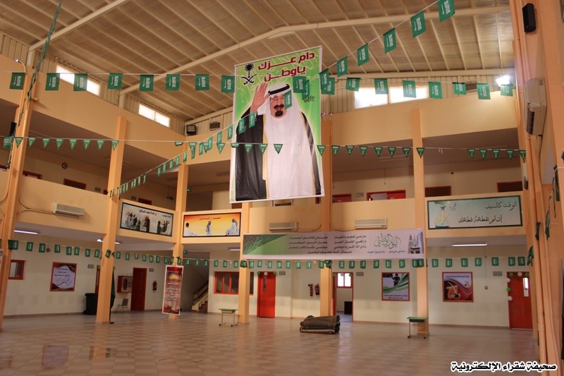 حيث ازدانت اروقة المدرسة بالعديد من اللوحات الوطنية والعلم السعودي وكذلك سور المدرسة الخارجي , ووزعت اوشحة العلم السعودي على جميع الطلاب منذ الطابور الصباحي الذي تناولت فيه الإذاعة الصباحية اليوم الوطني بكل خاص وقصة توحيد هذا الوطن الشامخ على يد المؤسس الملك عبدالعزيز طيب الله ثراه .وصولاً إلى قائد المسيرة الملك عبدالله بن عبدالعزيز حفظه الله , وخصصت الحصة الأولى من اليوم للحديث عن اليوم الوطني اجانب مسابقة للرسم تحاكي المناسبة .