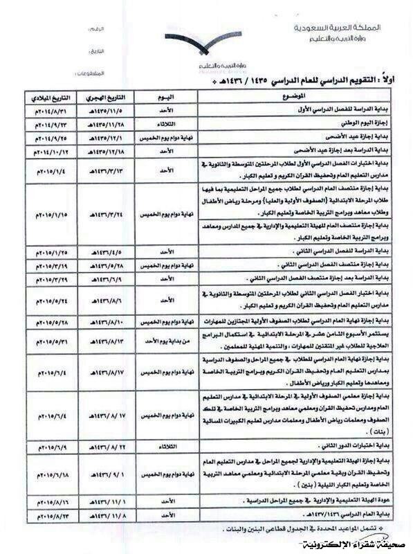 أعلنت وزارة التربية والتعليم عن التقويم الدراسي للعام المقبل 1435/1436 وآلية تنظيم الإجازات لشاغلي وشاغلات الوظائف التعليمية.