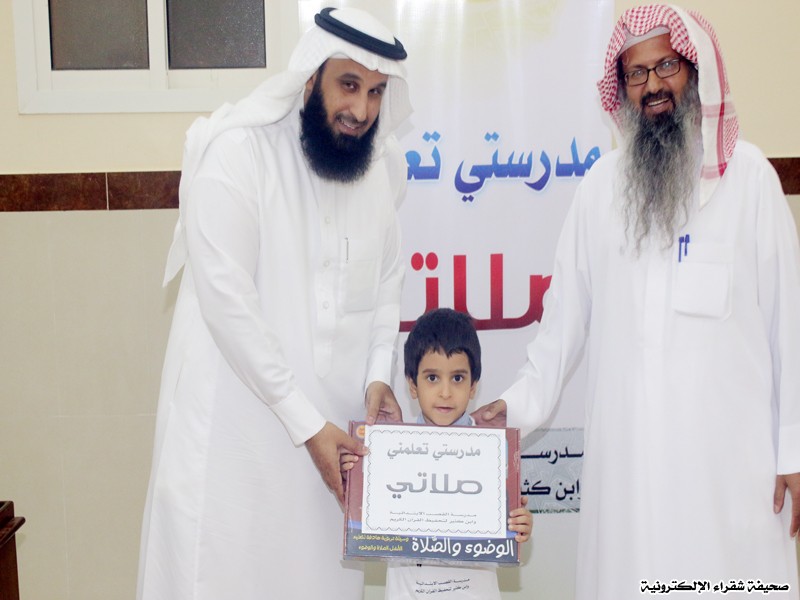 اقامت المدرسة الابتدائية وابن كثير لتحفيظ القاران الكريم بالقصب برنامج مدرستي تعلمني صلاتي وذلك في مسجد ابي بكر الصديق بالقصب وذلك يوم الخميس 9-11-1435هـ لربط الطلاب بالصلاة منذ الصغر وقد حضر البرنامج مدير المدرسة الاستاذ عبدالرحمن المظاهر ورئيس قسم الارشاد بادارة التربية والتعليم الاستاذ عبيد الحبيل وعدد من اولياء الامور وقد قام بتنفيذ البرنامج الاستاذ عبدالرحمن السويلم والاستاذ احمد المقحم حيث تم تعليم الطلاب كيفية الصلاة والاخطاء التي يقع فيها المصلي وادآب المسجد بد ذلك تم تسليم الطلاب الهدايا لمشاركتهم في هذا البرنامج وفي نهاية البرنامج شكر مدير المدرسة الاستاذ عبدالرحمن المظاهر لجميع من عمل كلاً في مجاله.