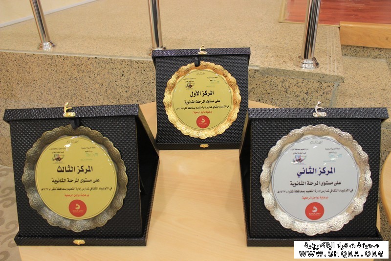 صحيفة شقراء - مشعل القصيّر (تصوير : حسن المرجان) بحضور سعادة مدير إدارة التعليم بمحافظة شقراء الأستاذ / سامي بن عبدالله الشويمي ومساعد مدير التعليم للشؤون التعليمية الاستاذ /عبدالله بن ناصر الفرحان وحضور رئيس مجلس إدارة دواجن الرمحية الوجيه /عبدالعزيز بن صالح العبداللطيف الداعم لهذا الأولمبياد وعدد من رؤساء الأقسام وقادة المدارس المشاركة والمشرفين التربويين والطلاب اختتم يوم أمس الاربعاء 8 / 5 / 1437 هـ الأولمبياد الثقافي لمدارس تعليم شقراء للبنين بإقامة نهائيات جميع المراحل (ابتدائي - متوسط - ثانوي) وقد جاءت النتائج على النحو التالي :