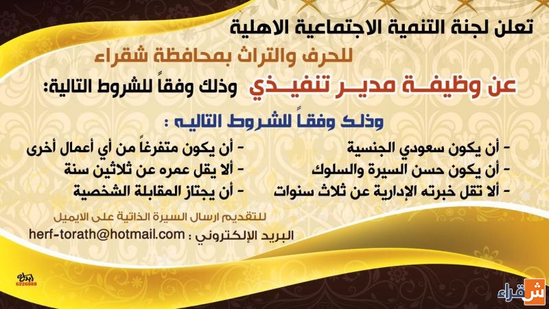 أعلنت لجنة التنمية الاجتماعية الأهلية للحرف والتراث بمحافظة شقراء عن رغبتها في توظيف مدير تنفيذي للجنة وفق الشروط التالية: