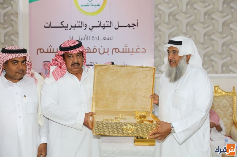 اقام منسوبي بلدية القصب حفل تكريم بمناسبة ترقية مدير البلدية الاستاذ دغيشم بن فهد الدغيشم للمرتبة الثالثة عشر وذلك بحضور رئيس بلدية الدوادمي المهندس عادل الشهري ورئيس بلدية شقراء المهندس عبدالله الحربي ورئيس بلدية العيينة والجبيلة الاستاذ ناصر المتعب ورئيس بلدية الجلة وتبراك الاستاذ محمد القحطاني كما حضر الحفل رئيس المجلس البلدي بالقصب الاستاذ فيصل القاسم حيث بدء الحفل بتقديم الاستاذ عبدالرحمن الراشد بعد ذلك قام عدد من منسوبي البلدية بتقديم الدروع والهدايا حيث قدم منسوبوا بلدية القصب و رئيس واعضاء المجلس البلدي بالقصب ومدير ادارة الخدمات الاستاذ عبدالعزيز الغنام ومدير ادارة المتابعة المكلف الاستاذ عثمان المنيع و الاستاذ سحمي الدغيلبي وعائلة الغنام ممثله بابناء عبدالرحمن الغنام (خالد الغنام وعبدالله الغنام وعبدالعزيز الغنام) الاستاذ محمد المقحم والاستاذ تركي الدغيلبي والاستاذ راشد المغامسي دروعاً تذكارية بهذه المناسبة بعد ذلك شكر رئيس البلدية الجميع مشاعرهم الطيبة بعد ذلك تفضل الجميع للعشاء المعد لهذه المناسبة.