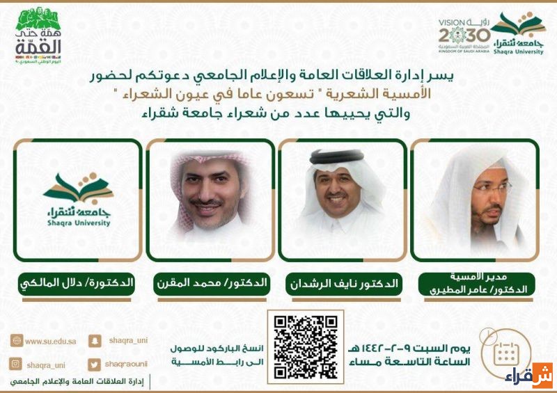 احتفالا باليوم الوطني ال90 نظمت إدارة العلاقات العامة والإعلام بجامعة شقراء أمسية شعرية بعنوان" تسعون عاما في عيون الشعراء" أحياها نُخبة من شعراء جامعة شقراء هم :