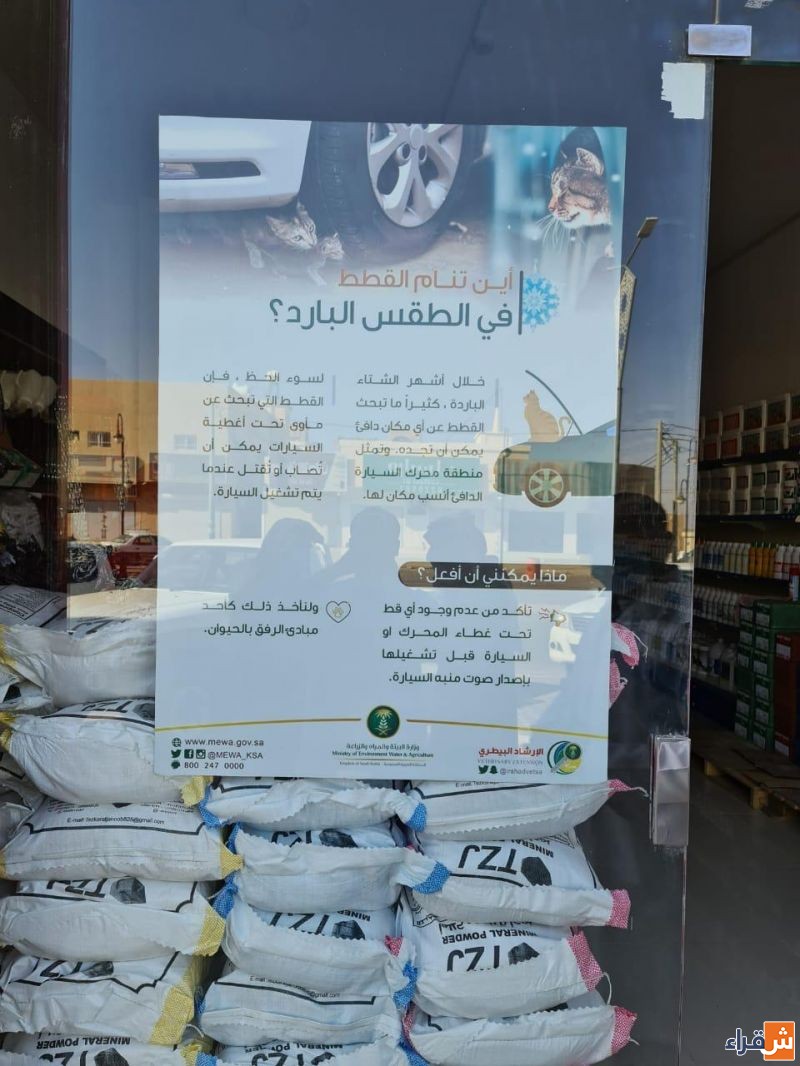 قام مكتب وزارة البيئة والمياه والزراعة بمحافظة شقراء بحملة توعوية عن الرفق بالقطط في فصل الشتاء ودخولها بجانب محركات السيارات للبحث عن الدفأ وضرورة اتخاذ الاحتياطات اللازمة التي تحول دون حدوث إصاباتها عن طريق نشر ملصق توعوي يتضمن كافة الطرق لضمان سلامة القطط من منطلق يحث عليه ديننا وواجب انساني ناحية هذه الكائنات